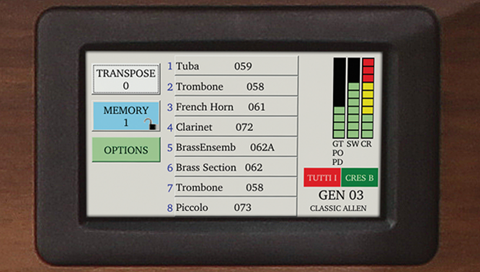 Standard stop lists: Classic Allen, English, Cavaillé-Coll, Schlicker, Arp Schnitger, Aeolian-Skinner, Wurlitzer, Barton, Morton