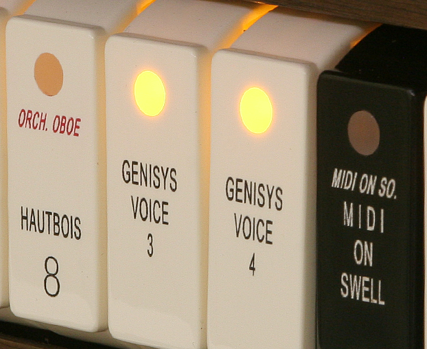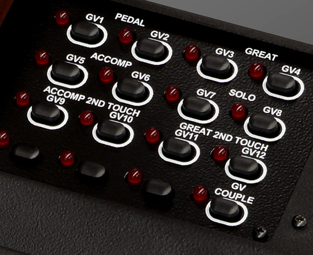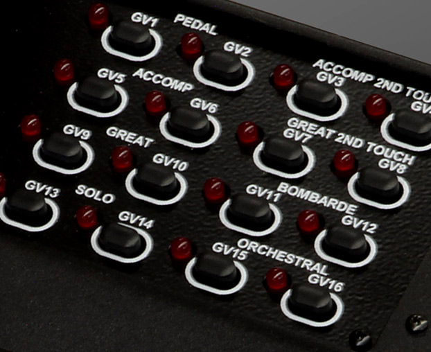 The HISTORIQUE IIG, 28 Stop, Two-manual organ is equipped with Allen's efficient LED stop controls.