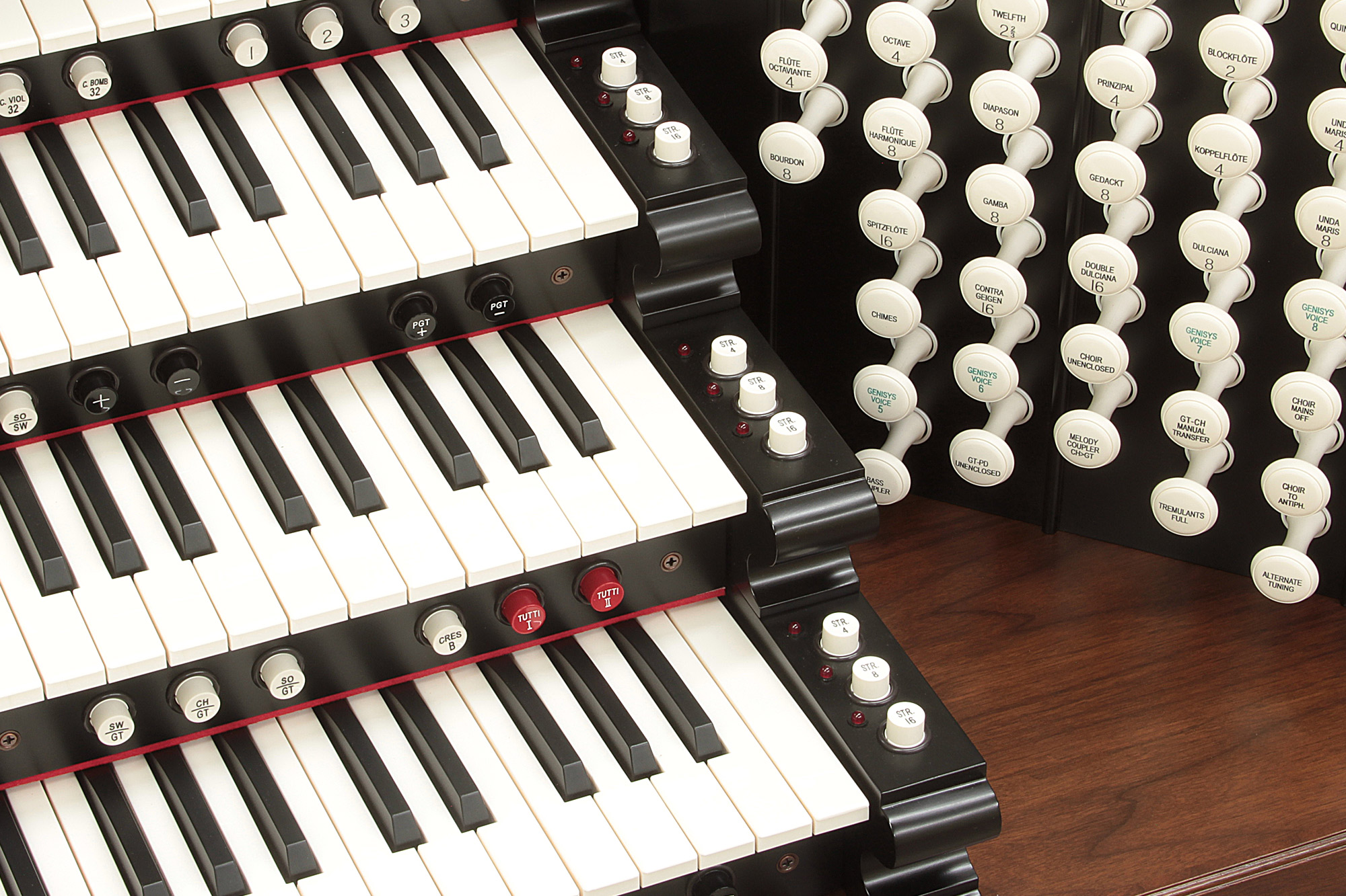 The HISTORIQUE IIG, 28 Stop, Two-manual organ is equipped with Allen's efficient LED stop controls.