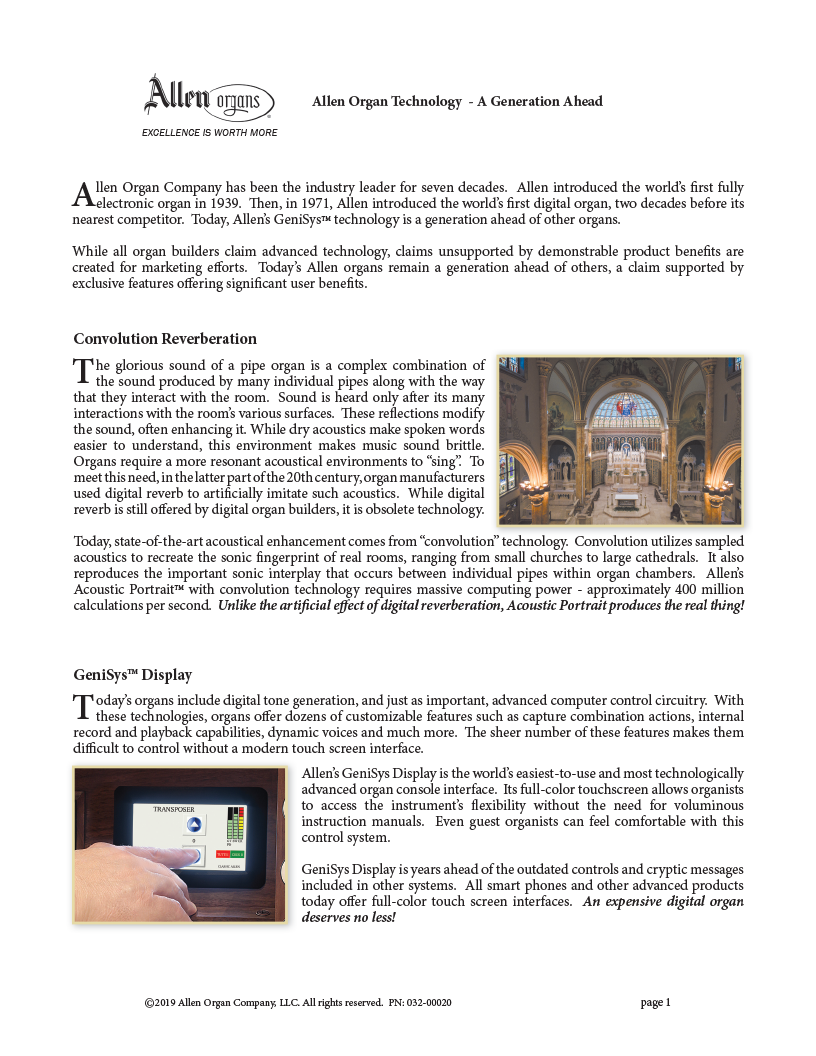 Superior sound comes from a combination of greater experience sampling pipe organs and advanced sound-producing technology. Experience matters! Allen introduced the world's first digitally sampled organ in 1971, nearly two decades prior to its nearest competitor. Allen's current GENISYSâ„¢ technology includes up to 48 advanced DSP's (Digital Signal Processors) working in parallel; supercomputer power for superior sound production. And Allen organs can be voiced to perfection to any school of organ design!