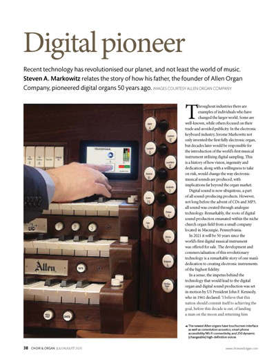 Allen introduces the Digital Computer Organ (sampling) predating other builders' digital organs by 20 years. First Allen Digital Computer Organ resides in the Smithsonian Institution. Allen has since created the largest library of digitally sampled pipes.