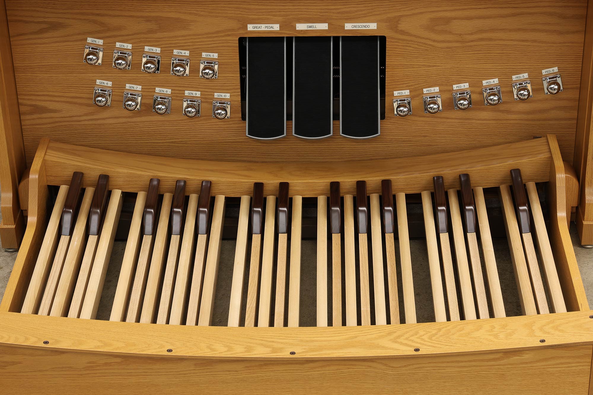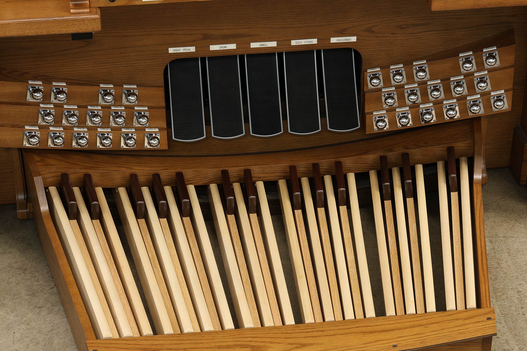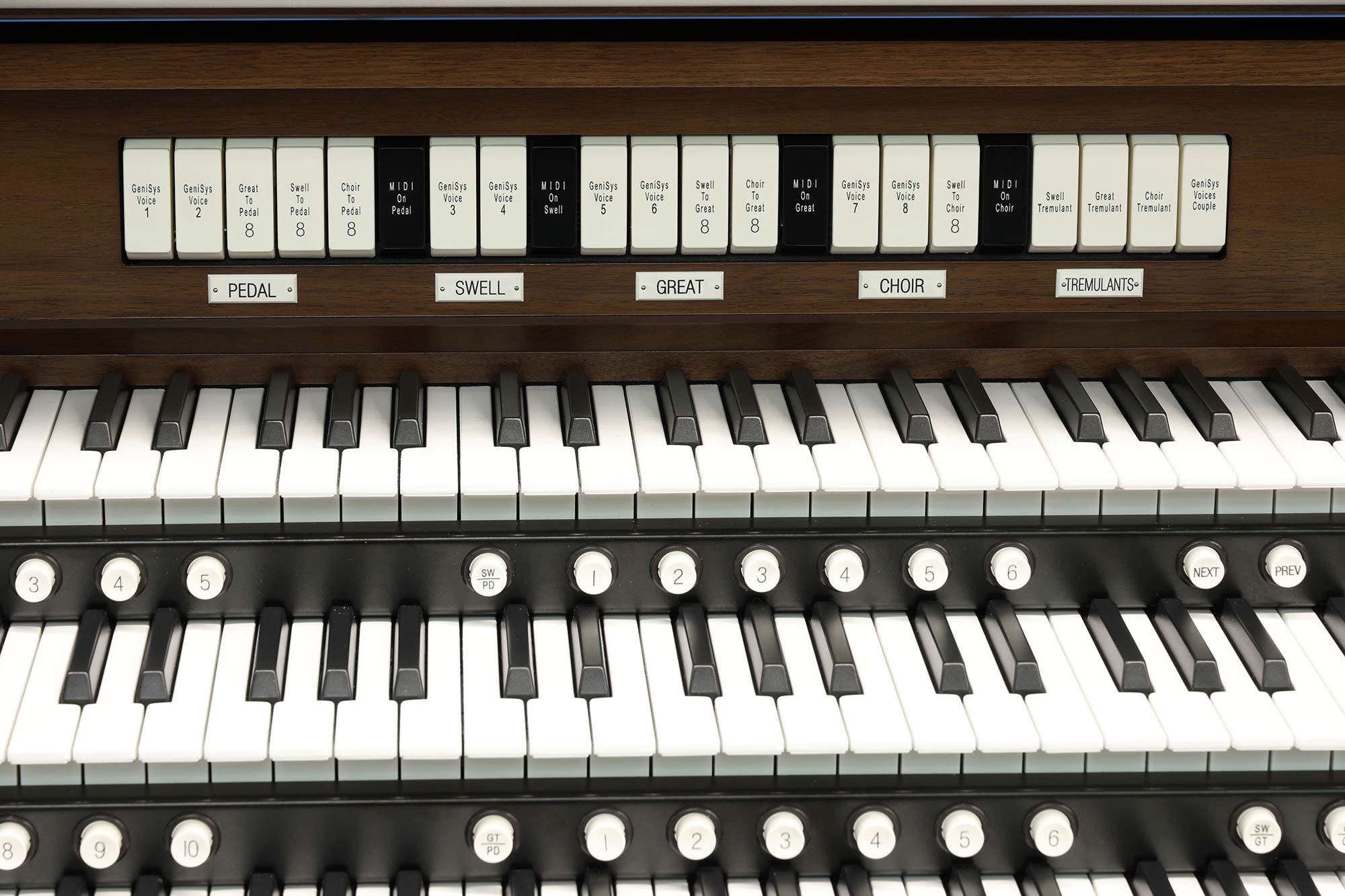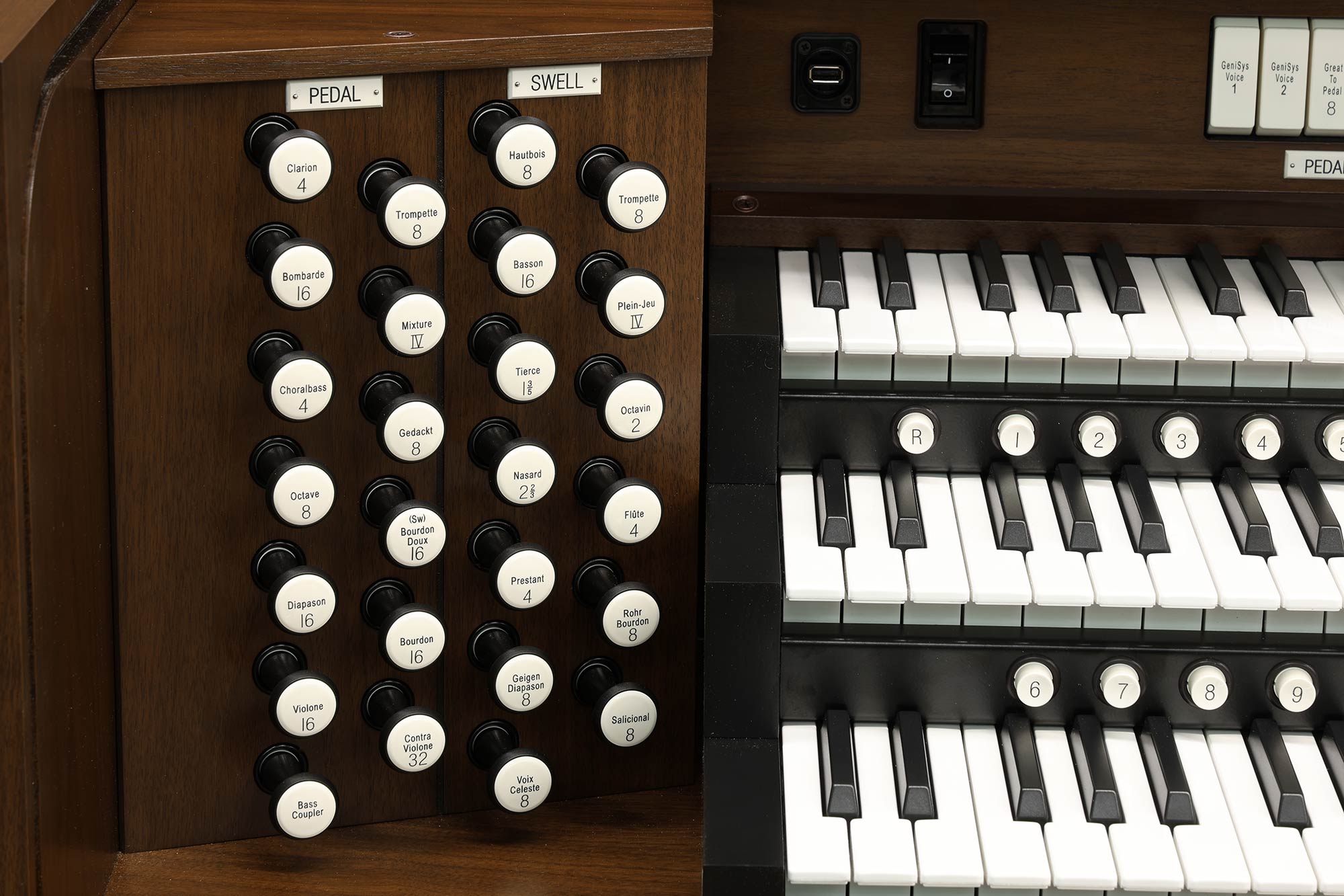The HISTORIQUE IIIG, 34 Stop, Two-manual organ is equipped with Allen's efficient LED stop controls.