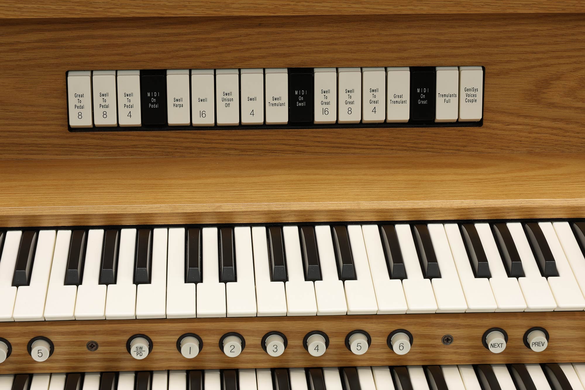 The HISTORIQUE IIG, 28 Stop, Two-manual organ is equipped with Allen's efficient LED stop controls.